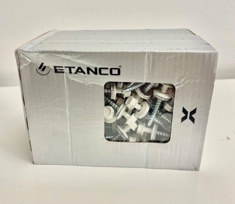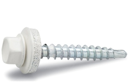 Farmarskruven med vit bricka, dimensioner 4,8x35 mm, finns i förpackningar om 250 stycken. Den är speciellt designad för utvändig infästning av byggplåt och kombinerar borrning och gängpressning. Skruven matchar färgen på byggplåten för en enhetlig estetik.