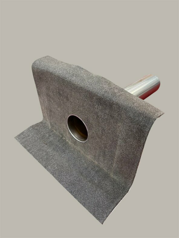 Tillverkade i 0,8 mm tjock rostfri stålplåt. Bräddavloppet har en 350 x 350 mm perforerad fläns, som ger en säkrare infästning. Vid montering ska en intäckningskrage av bitumenbaserat tätskikt appliceras mellan underlaget och brunnen/avloppet. En mycket stark vidhäftning uppnås då tätskiktet svetsas mot flänsen och de båda tätskikten sammanbinds genom perforeringen.