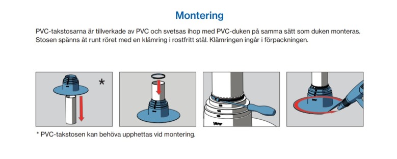 Våra takstosar, tillverkade av väderbeständigt PVC, används för att täta genomföringar i PVC-duk på tak. De har en bred räfflad krage som underlättar och garanterar en god tätning vid klistring mot underlaget. Takstosarna är designade för att klara det krävande svenska klimatet och levereras med en rostfri slangklämma.