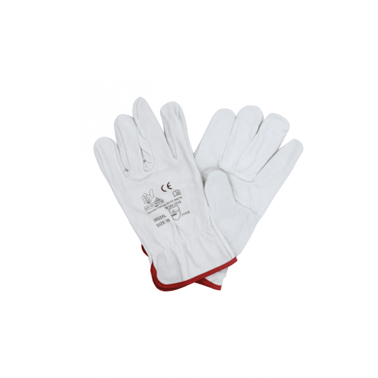 Handsken är tillverkad av högkvalitativt oxläder, känt för sin hållbarhet och tålighet, och blir därför ett utmärkt val för arbets- och skyddshandskar. Kantförstärkningen, såsom en bård längs kanten, förstärker dess slitstyrka och förlänger livslängden.