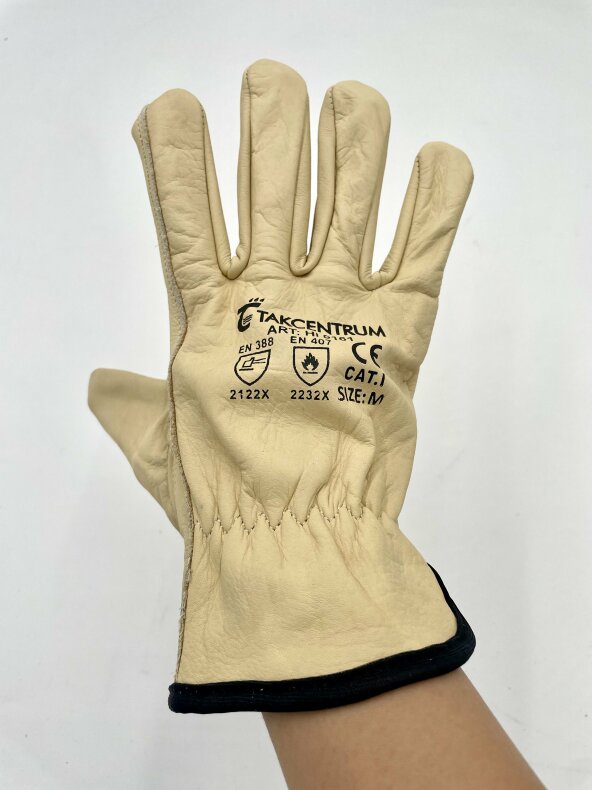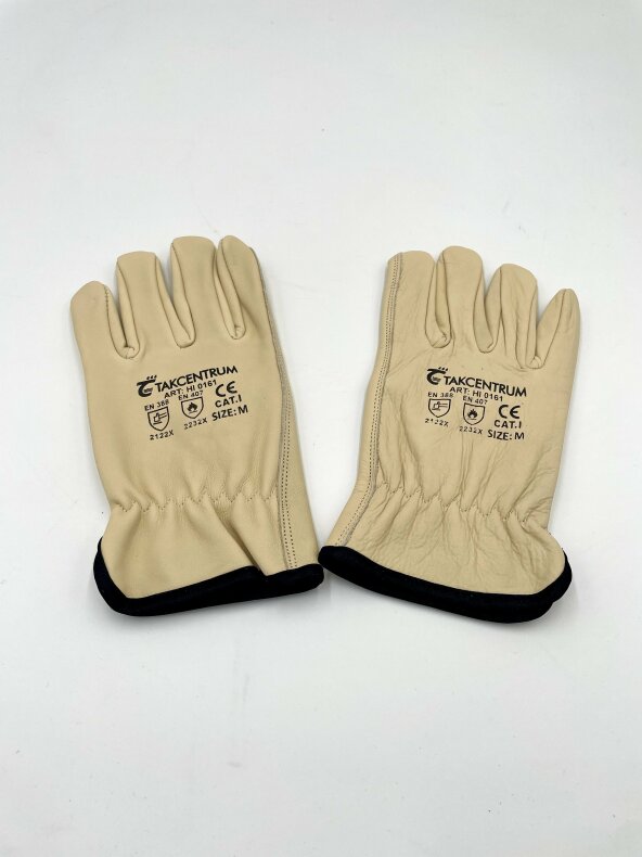 Takcentrum's svetshandskar i beige med svart kant finns i tre storlekar: S, M och L. Denna specifika artikel är i storlek Medium och är gjord av högkvalitativt läder för att säkerställa både hållbarhet och komfort.