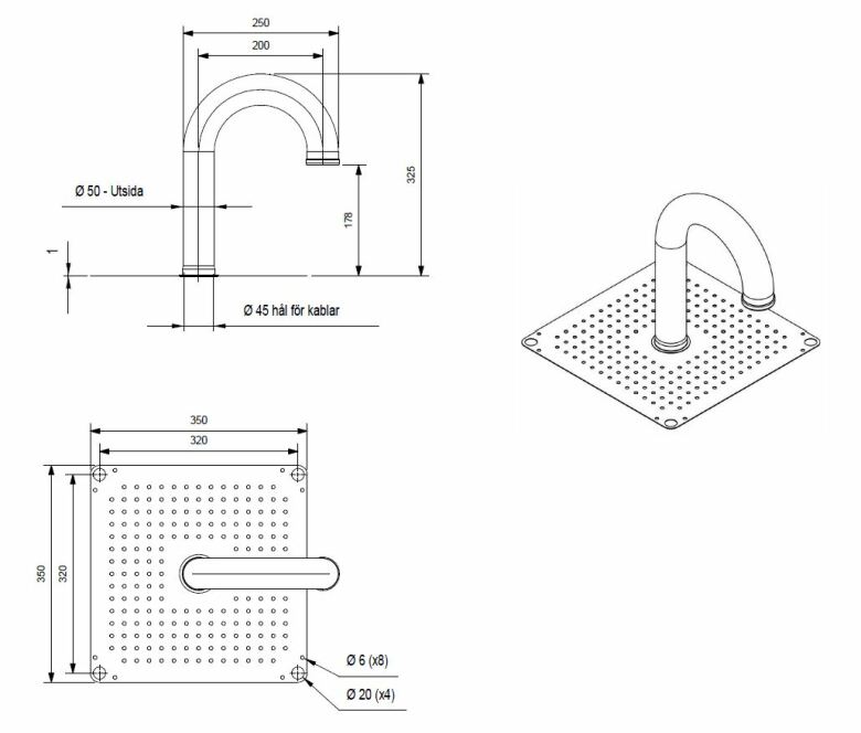 För vattentät kabeldragning på platta tak täckta med takpapp, passar kablar upp till Ø50 mm. Idealisk för installation av solpaneler, luftkonditioneringsenheter och andra elektriska apparater. Den avtagbara böjen gör den enkel och flexibel att montera.