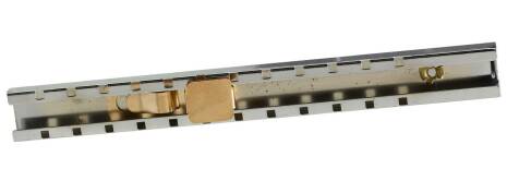En täljstenskritshållare i pressad design med en praktisk klämma. Tillverkad av förnicklat material, den är 145 mm lång, 40 mm bred och 7 mm hög.