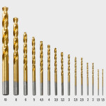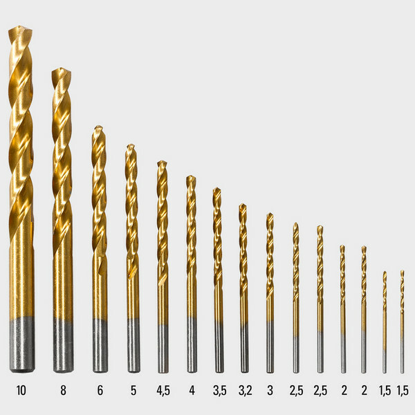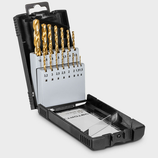 Borrsatsen innehåller storlekar från 1,5 till 10 mm i vanliga steg, med flera storlekar upp till 2,5 mm. Varje borr har tydlig måttinformation som är lätt att läsa av även efter upprepad användning.