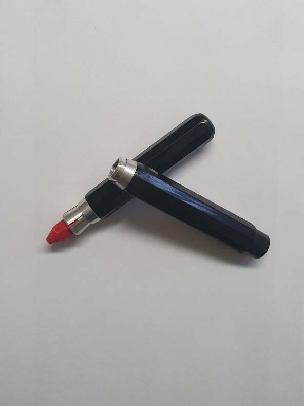 Tillverkad av aluminium med blå plastöverdrag och utformad med en frammatning liknande en vanlig stiftpenna.