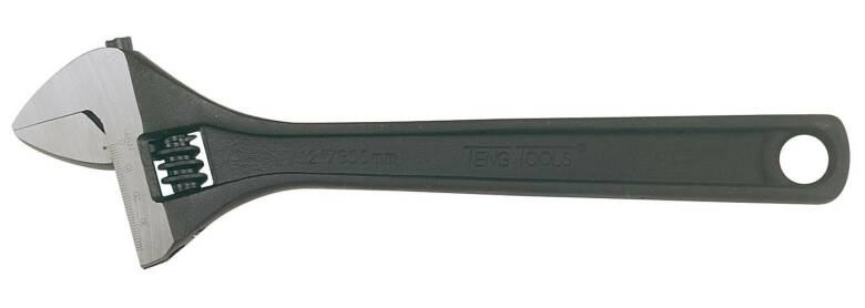 Teng Tools skiftnyckel kännetecknas av sin inbyggda mätskala och är tillverkad i kromvanadinstål för överlägsen hållbarhet och pålitlighet. Den har en käftvinkel på 15° och en rörlig käft utan utskjutande delar, vilket ger bättre arbetsutrymme även i trånga utrymmen. Skiftnyckeln följer internationella standarder såsom ISO 6787-1982, ASME B.107.8-1996, BS 6333-1995, DIN 3117-1988 och JIS B4604-1976. Den är fosfaterad för ökad korrosionsbeständighet och har ett praktiskt hål i änden av skaftet.
