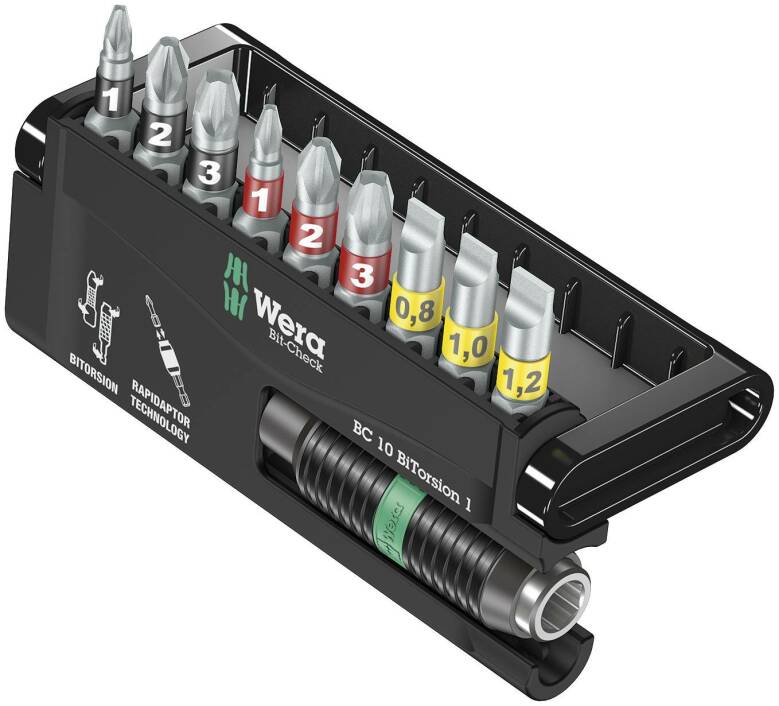 Bitssatsen från Wera levereras i en praktisk plastkassett och innehåller en bitshållare med snabbväxelchuck. När du byter bitar frigörs magneten automatiskt, vilket gör det enkelt att snabbt byta små bitar. Bitshållaren har en glidlagrad hylsa som gör att du kan hålla i chucken under användning.
